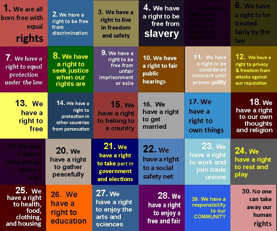 Articles 28–30 establish the general means of exercising these rights, the areas in which the rights of the individual cannot be applied, the duty of the individual to society, and the prohibition of the use of rights in contravention of the purposes of the United Nations Organization.[15]